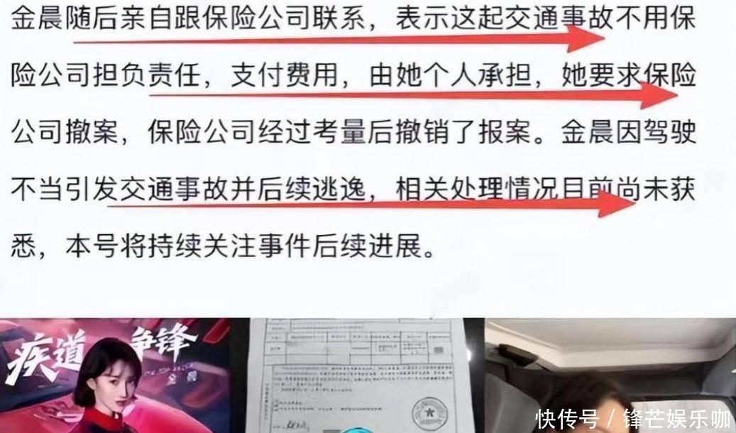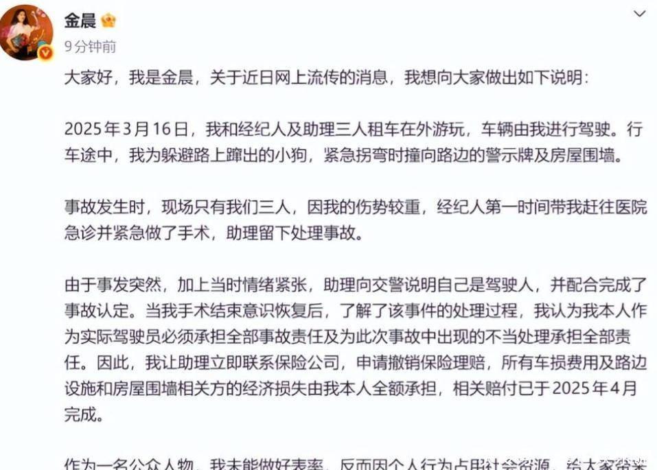 然而,在事故发生之后更换当事人来处理此事,这样的做法着实存在问题,因而金晨本人迅速于社交平台发布内容对此事予以回应。从她所发布的动态能够知晓,她表示那时车上一共有三个人,并且她也认可车子的确是由她驾驶的,然而途中突然有一只小狗窜了出来,她为了避开小狗而急忙转动了方向盘。